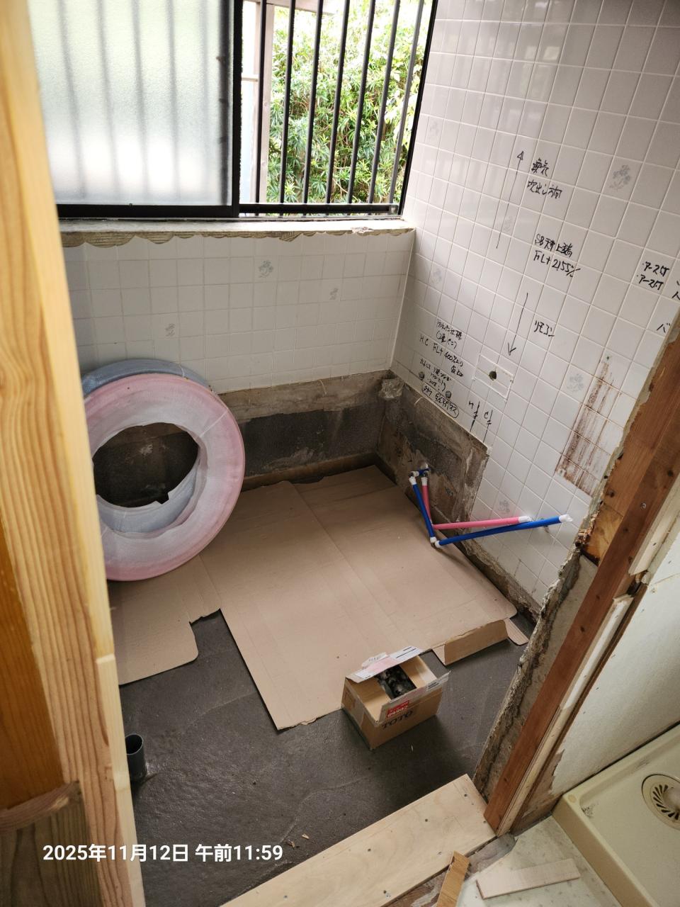タイル張りの浴室を解体するとほぼほぼ、入口の土台が無くなっています。 タイルの隙間から水が差すのと、そこに白蟻。 生きるために、皆必死なのかなぁ~と。 月曜日に解体を始めて、 土間コン・給排水逃げ・ユニットバス設置・仕上げ工事と、金曜日の夜にはお風呂に入れま~す。