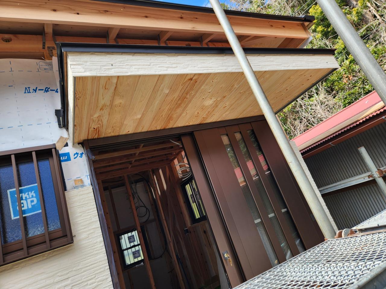 玄関庇のミノコ屋根は軒天に桧の板を貼りいい雰囲気です。